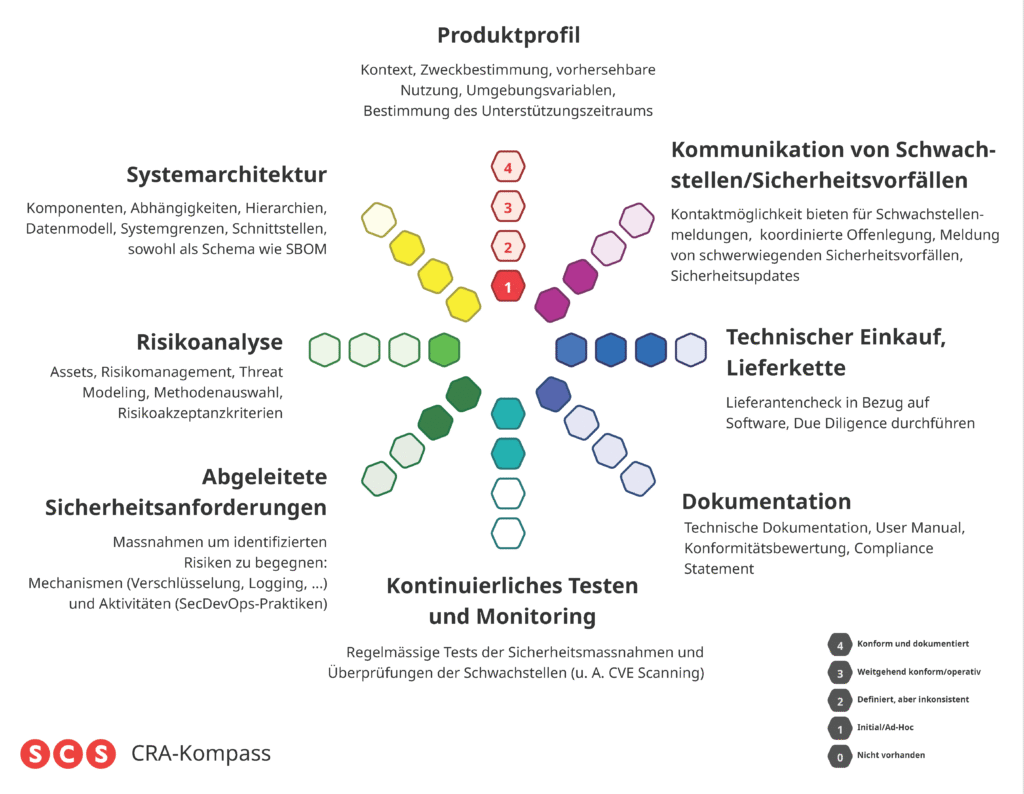 - CRA Überblick und Ökosystem CRA Kompass (rechte Seite): Produktprofil, Kommunikation bezüglich Schwachstellen und Sicherheitsvorfällen, Lieferkette und Dokumentation